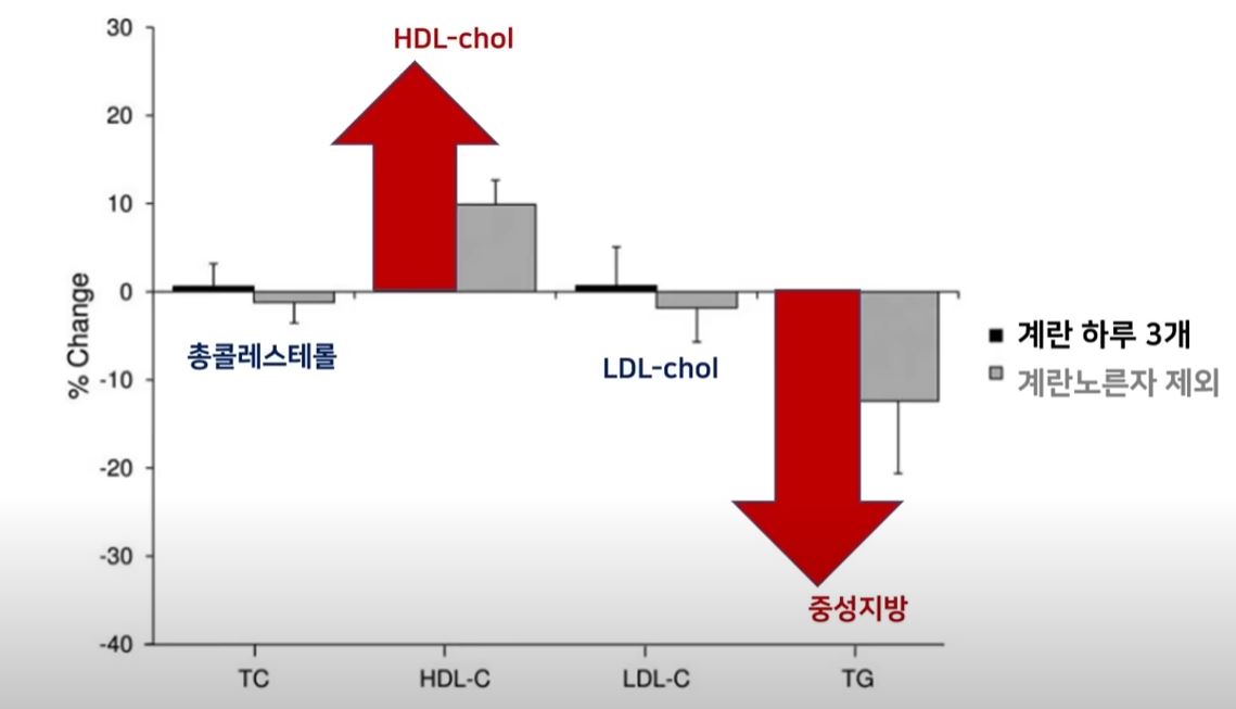 게다가 계란 노른자에 들어있는 콜레스테롤은 고밀도 콜레스테롤(HDL)인데 이는 혈중 지질 성분을 몸 밖으로 배출시키는 역할을 하는 콜레스테롤이기 때문에 오히려 계란을 먹어주었을 때 혈관에 도움이 됩니다.