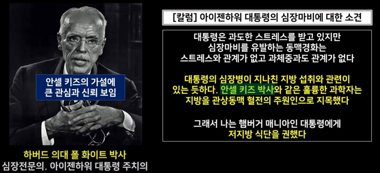 1955년 64세 아이젠하워 대통령이 심근경색으로 쓰러졌습니다. 그때 아이젠하워 대통령의 주치의였던 사람이 하버드 의대의 폴 화이트 박사인데 그는 안셀 키즈 박사의 지질가설에 큰 관심과 신뢰를 하는 사람이었습니다. 폴 화이트는 신문의 칼럼에 아이젠하워 대통령의 심근경색에 대한 소견으로 안셀 키스 박사의 가설을 지지하며 안셀 키즈의 지질 가설에 힘을 실어주었습니다.