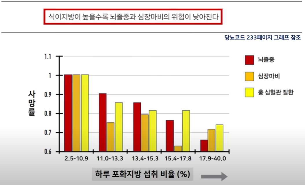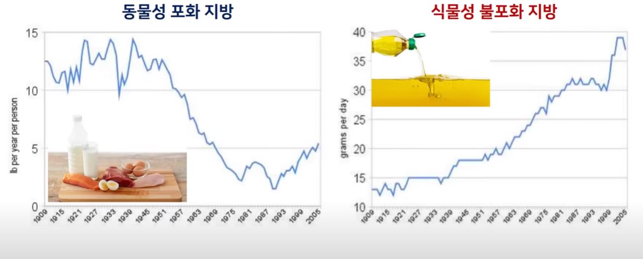 미국에서 5만명을 대상으로 8년간 진행된 '저지방 식단과 심혈관질환 위험도(2006)'에 관한 연구에 따르면 포화지방 섭취량을 줄이고 채소, 과일, 곡물 섭취를 늘리는 식단을 유지했을 때 관상동맥질환, 뇌졸중 등 심혈관 질환의 발병률이 전혀 줄어들지 않았고, 그에 따른 긍정적인 효과가 전혀 없다는 결과가 나왔습니다. 우리가 아무런 의심없이 믿어왔던 상식이 사실은 전혀 사실이 아니었다는 거죠. 오히려 동물성 포화지방의 섭취를 줄이고 저지방 식단과 식물성 지방 섭취를 늘렸을 때 제 2형 당뇨와 같은 질병의 발병률이 급증했습니다.