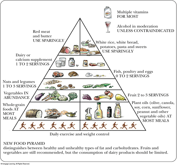 위의 이미지는 미국 농무부에서 발표한 식품 피라미드로 가장 많이 섭취해야 하는 것은 곡물류, 식물성 기름, 채소·과일류이고 상단에 위치한 고기, 버터, 유제품은 적게 섭취해야 하는 것으로 되어 있습니다. 이러한 식품 피라미드는 저지방 위주의 식단을 건강식으로 규정하고 있기 때문에 만들어진 피라미드입니다.